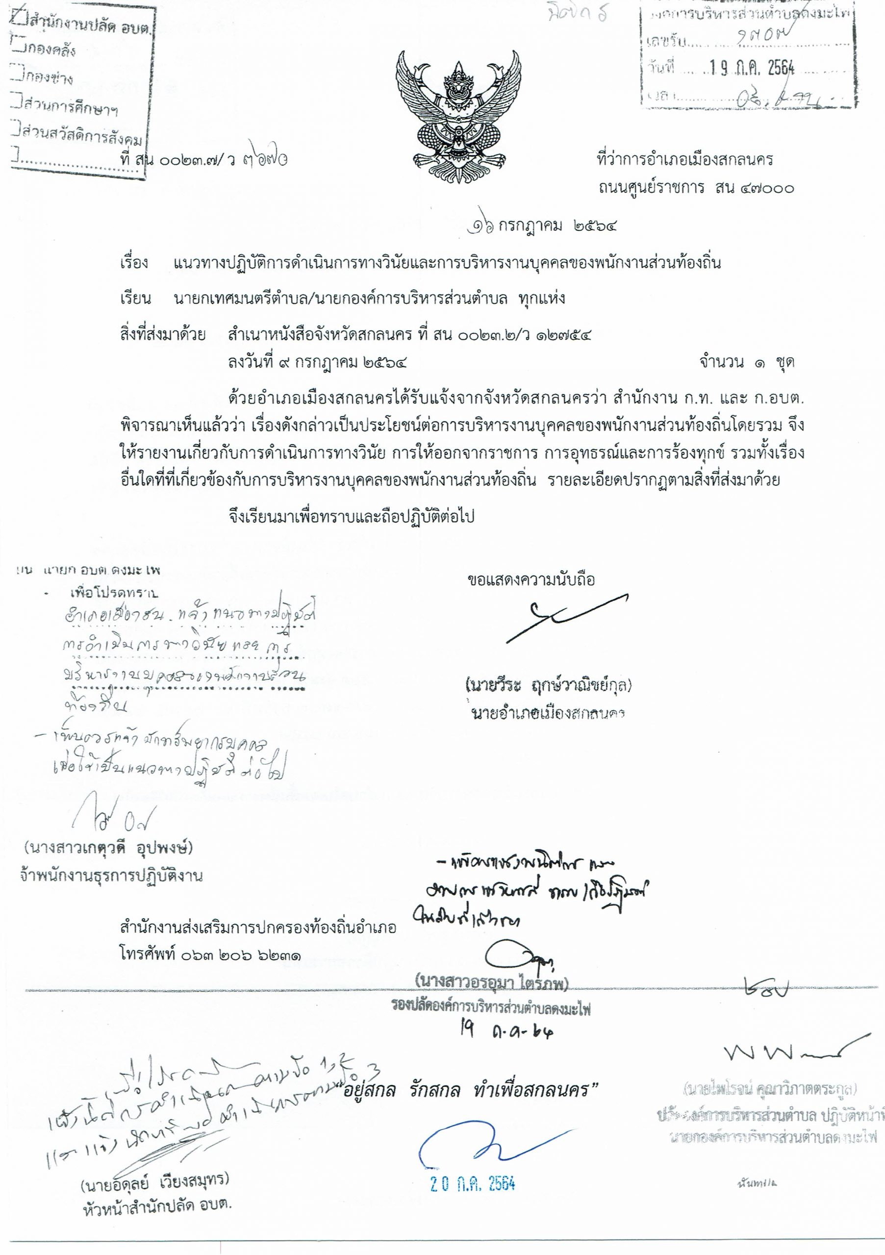 หนังสือ อำเภอเมืองสกลนคร โดย สถอ.เมืองสน. ที่ สน ๐๐๒๓.๗/ว ๓๖๗๐ ลงวันที่ ๑๖ กรกฎาคม ๒๕๖๔ เรื่อง แนวทางปฏิบัติการดำเนินการทางวินัยและการบริหารงานบุคคลของพนักงานส่วนท้องถิ่น