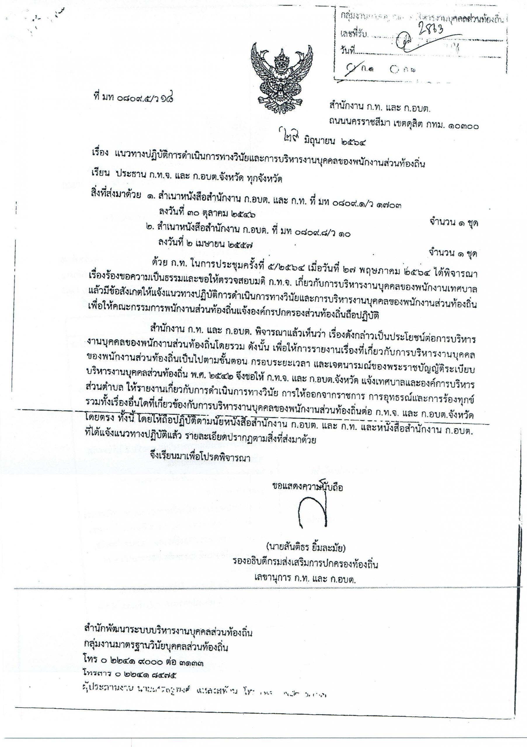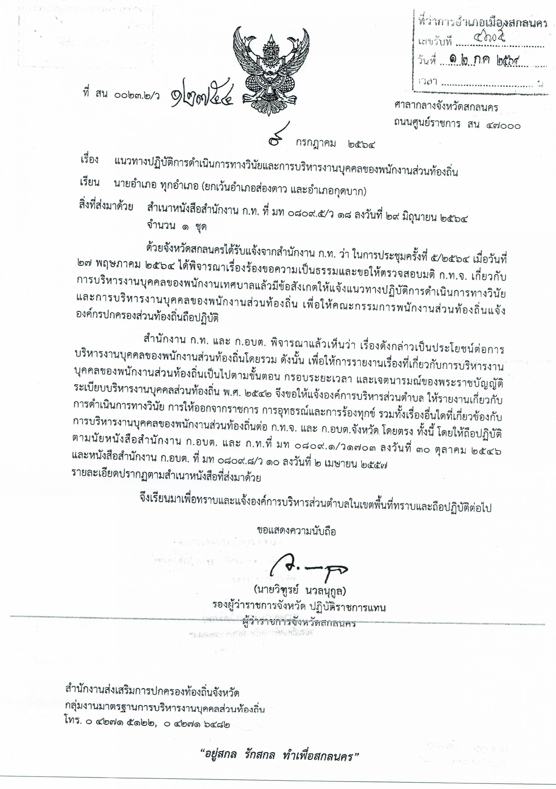 หนังสือ จังหวัดสกลนคร โดย สถจ.สน. ที่ สน ๐๐๒๓.๒/ว ๑๒๗๕๔ ลงวันที่ ๙ กรกฎาคม ๒๕๖๔ เรื่อง แนวทางปฏิบัติการดำเนินการทางวินัยและการบริหารงานบุคคลของพนักงานส่วนท้องถิ่น