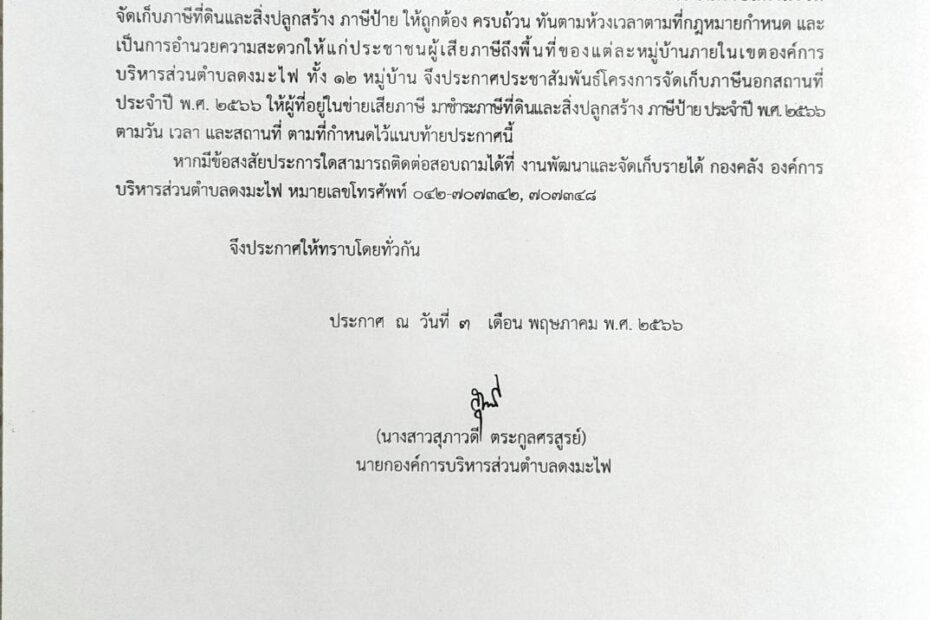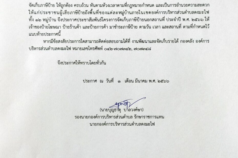 ประกาศองค์การบริหารส่วนตำบลดงมะไฟ เรื่อง การยื่นแบบแสดงรายการภาษีป้าย ประจำปี พ.ศ. 2567ข่าวประชาสัมพันธ์by กองคลัง อบต.ดงมะไฟ7 ธันวาคม 2023