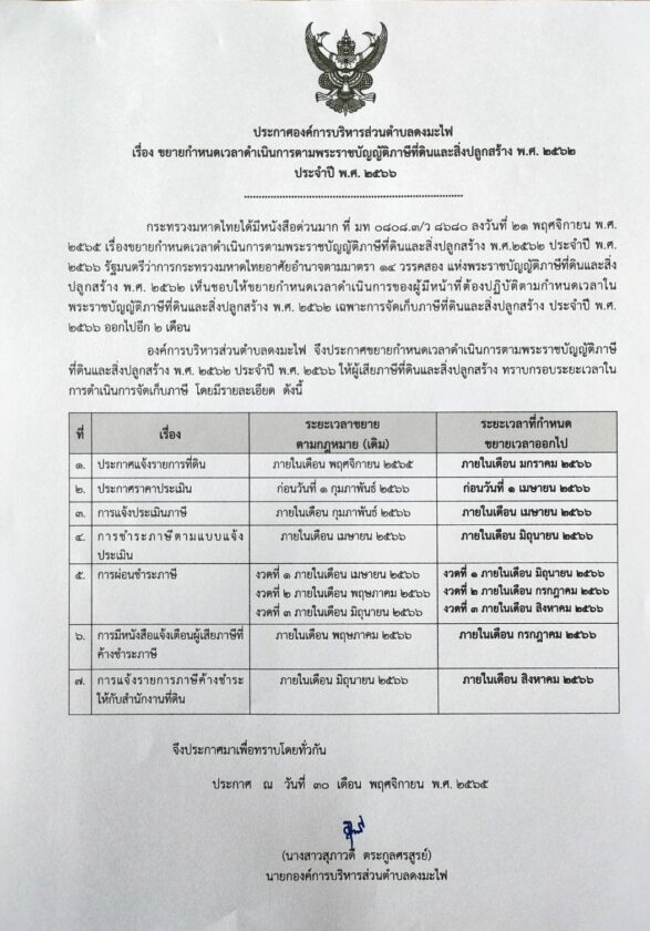 ประกาศองค์การบริหารส่วนตำบลดงมะไฟ เรื่อง ขยายกำหนดเวลาดำเนินการตามพระราชบัญญัติภาษีที่ดินและสิ่งปลูกสร้าง พ.ศ. 2562 ประจำปี พ.ศ. 2566