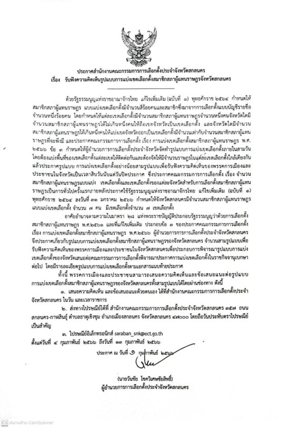 ระกาศสำนักงานคณะกรรมการการเลือกตั้งประจำจังหวัดสกลนคร เรื่อง รับฟังความคิดเห็นรูปแบบการแบ่งเขตเลือกตั้งสมาชิกสภาผู้แทนราษฎรจังหวัดสกลนคร