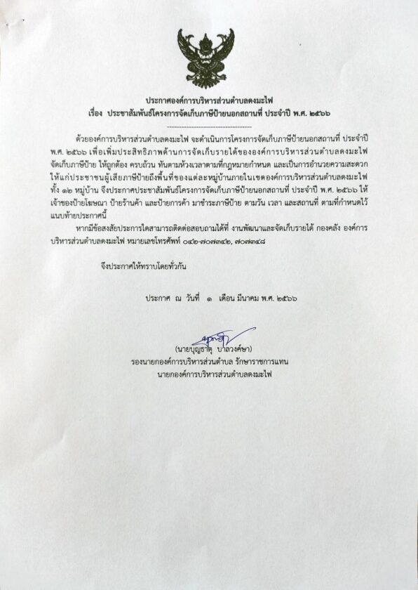 ประกาศองค์การบริหารส่วนตำบลดงมะไฟ เรื่อง ประชาสัมพันธ์โครงการจัดเก็บภาษีป้ายนอกสถานที่ ประจำปี พ.ศ. 2566ข่าวประชาสัมพันธ์by กองคลัง อบต.ดงมะไฟประกาศองค์การบริหารส่วนตำบลดงมะไฟ เรื่อง ประชาสัมพันธ์โครงการจัดเก็บภาษีป้ายนอกสถานที่ ประจำปี พ.ศ. 2566 จำนวนผู้เข้าชม : 299 FacebookFacebookXXLINELine