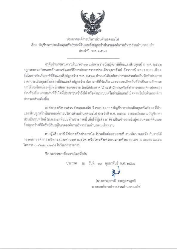 เรื่อง บัญชีราคาประเมินทุนทรัพย์ของที่ดินและสิ่งปลูกสร้างในเขตองค์การบริหารส่วนตำบลดงมะไฟ