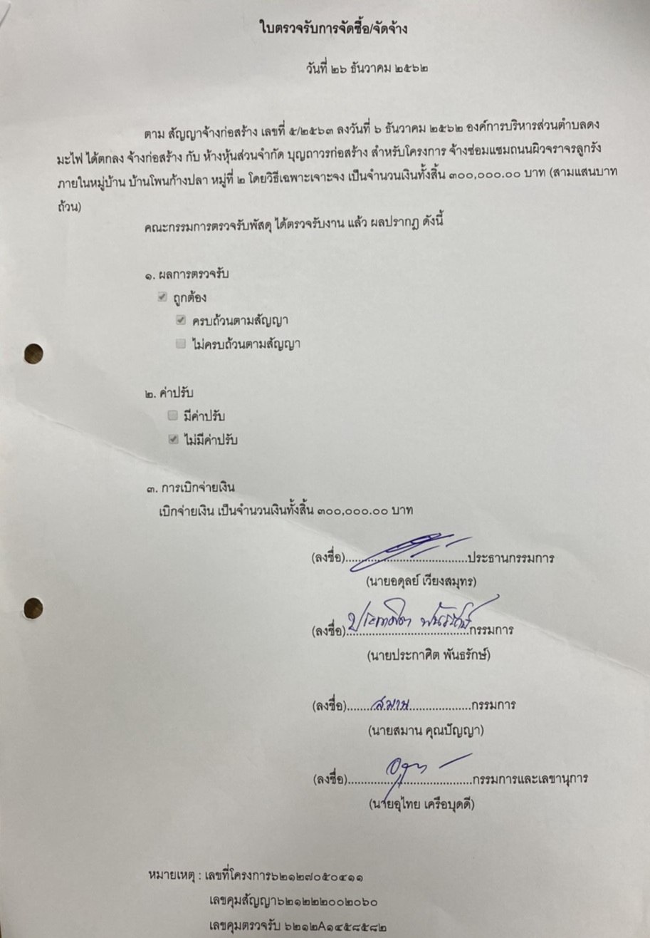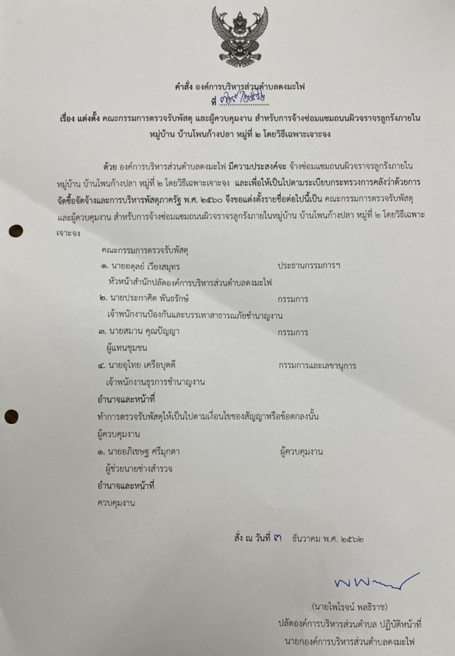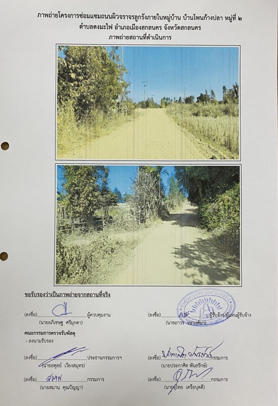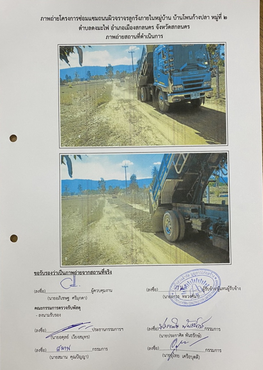 องค์การบริหารส่วนตำบลดงมะไฟ ได้จัดทำสัญญาจ้างก่อสร้างซ่อมเเซมถนนลูกรังภายในหมู่บ้านโพนกางปลาหมู่ที่ 2 ตำบลดงมะไฟ เพื่อเปิดโอกาศให้ประชาชนในหมู่บ้านผู้ต้องใช้ประโยชน์จากการบริหารสาธารณะ จึงได้เเต่งตั้งนายสมาน คุณปัญญา ซึ่งเป็นผู้เเทนที่ชุมที่ได้รับมติจากที่ประชมหมู่บ้าน เข้ามามีส่วนร่วมเเละตรวจสอบการจัดซื้อจัดจ้างของหน่วยงานเพื่อความโปร่งใสเป็นไปตามหลักธรรมาภิบาลในการบริหารราชการที่ดี ผลปรากฎว่าโครงการดังกล่าวเป็นไปด้วยความถูกต้องเรียบร้อยตามข้อกำหนดของทางราชการ