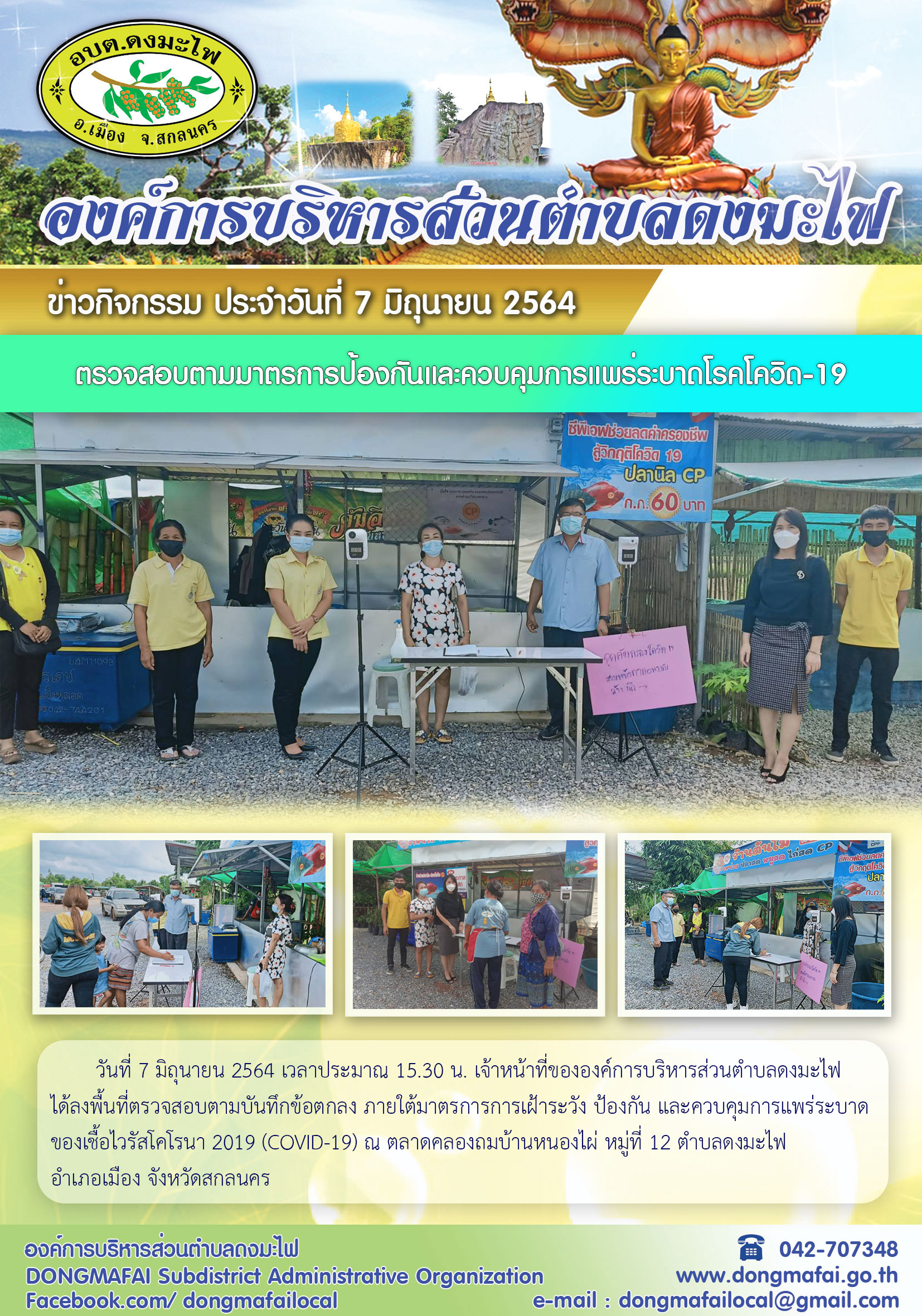 วันที่ 7 มิถุนายน 2564 จนท. อบต.ดงมะไฟ ลงพื้นที่ตรวจตลาดตามบันทึกข้อตกลง ภายใต้มาตรการการเฝ้าระวัง ป้องกัน และควบคุมการแพร่ระบาดของเชื้อไวรัสโคโรนา 2019 (COVID-19)