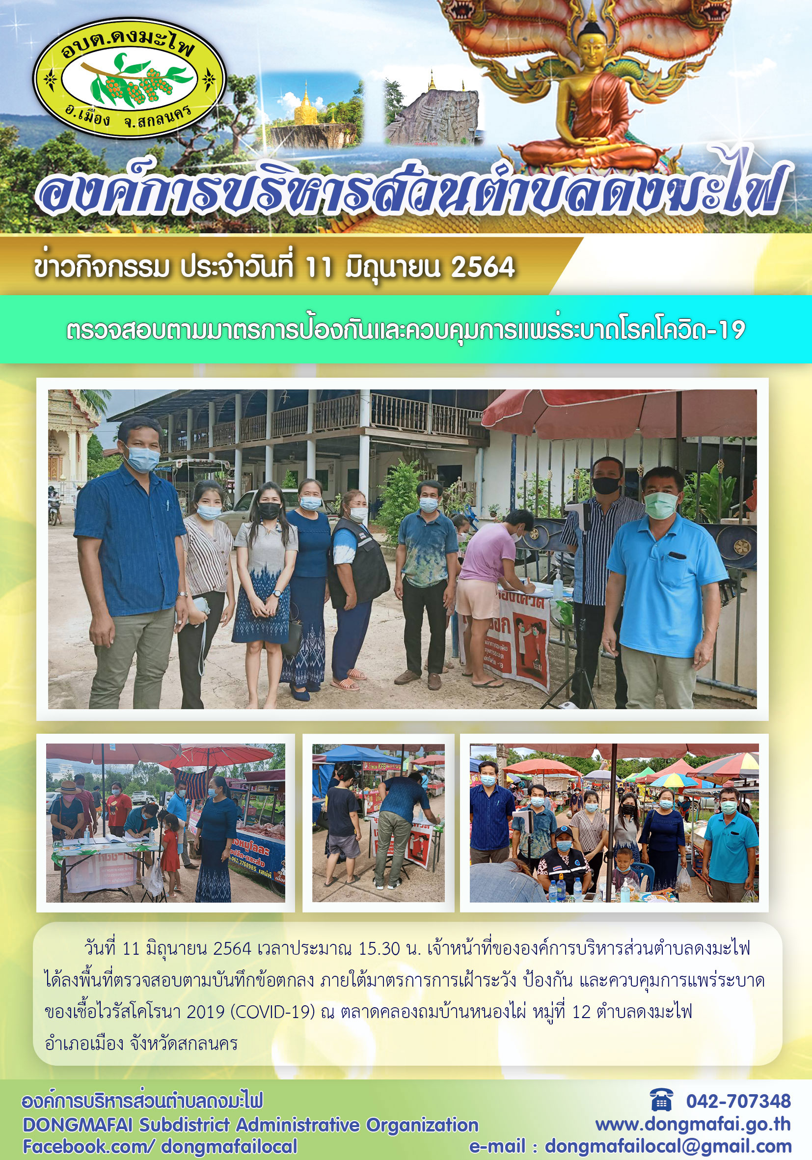 วันที่ 11 มิถุนายน 2564 จนท. อบต.ดงมะไฟ ลงพื้นที่ตรวจตลาดตามบันทึกข้อตกลง ภายใต้มาตรการการเฝ้าระวัง ป้องกัน และควบคุมการแพร่ระบาดของเชื้อไวรัสโคโรนา 2019 (COVID-19)
