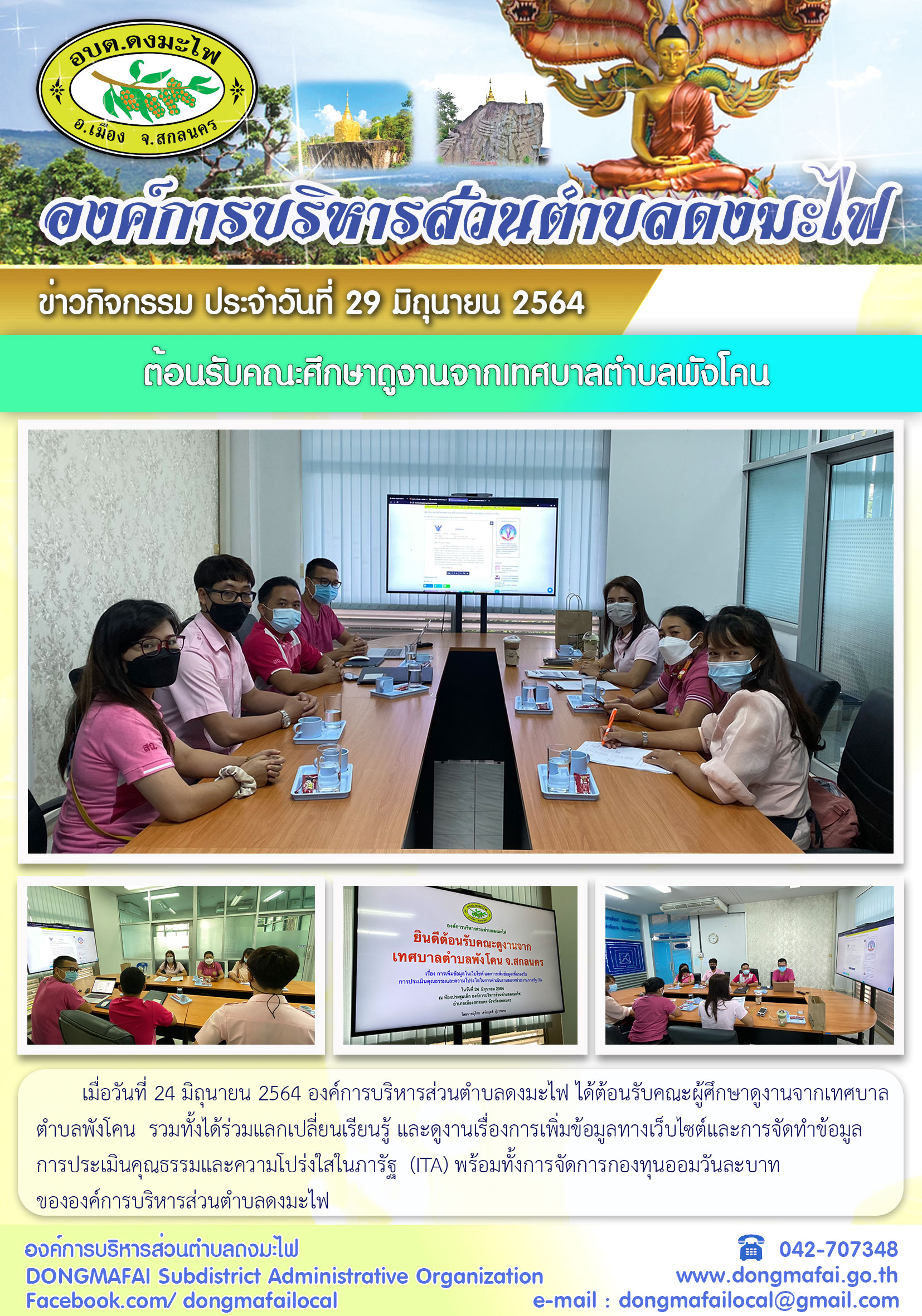 วันที่ 24 มิถุนายน 2564 เทศบาลตำบลพังโคน ร่วมแลกเปลี่ยนเรียนรู้ และดูงานเรื่องการเพิ่มข้อมูลทางเว็บไซต์และการจัดทำข้อมูลการประเมินคุณธรรมและความโปร่งใสในภารัฐ (ITA) พร้อมทั้งการจัดการกองทุนออมวันละบาท ขององค์การบริหารส่วนตำบลดงมะไฟ