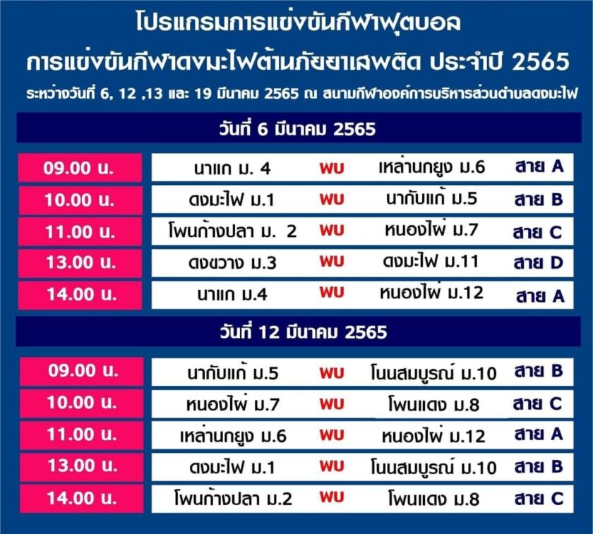 โปรแกรมการแข่งขันฟุตบอล กีฬาดงมะไฟต้านภัยยาเสพติด ประจำปี 2565ข่าวประชาสัมพันธ์by buntheingติดตามข้อมูลข่าวสารการแข่งขันกีฬาดงมะไฟต้านภัยยาเสพติดได้ที่เพจ กีฬาดงมะไฟต้านภัยยาเสพติด จำนวนผู้เข้าชม : 930 FacebookFacebookXXLINELine