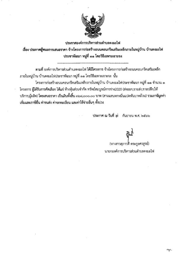 ประกาศผู้ชนะการเสนอราคา จ้างโครงการก่อสร้างถนนคอนกรีตเสริมเหล็กภายในหมู่บ้าน บ้านดงมะไฟประชาพัฒนา หมู่ที่ ๑๑ประกาศจัดซื้อจัดจ้างby กองคลัง อบต.ดงมะไฟประกาศผู้ชนะการเสนอราคา จ้างโครงการก่อสร้างถนนคอนกรีตเสริมเหล็กภายในหมู่บ้าน บ้านดงมะไฟประชาพัฒนา หมู่ที่ ๑๑ จำนวนผู้เข้าชม : 272 FacebookFacebookXXLINELine