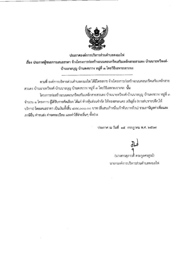 ประกาศผู้ชนะการเสนอราคา จ้างโครงการก่อสร้างถนนคอนกรีตเสริมเหล็กสายสวนดง บ้านนายทวีพงศ์-บ้านนายบุญ บ้านดงขวาง หมู่ที่ ๓ประกาศจัดซื้อจัดจ้างby กองคลัง อบต.ดงมะไฟประกาศผู้ชนะการเสนอราคา จ้างโครงการก่อสร้างถนนคอนกรีตเสริมเหล็กสายสวนดง บ้านนายทวีพงศ์-บ้านนายบุญ บ้านดงขวาง หมู่ที่ ๓ จำนวนผู้เข้าชม : 161 FacebookFacebookXXLINELine
