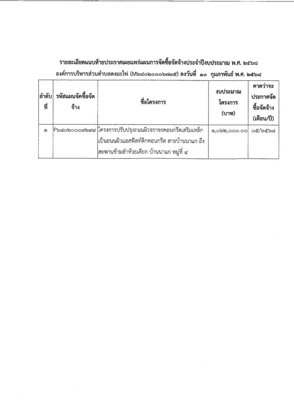 ประกาศเผยแพร่แผนการจัดจ้างโครงการปรับปรุงถนนผิวจราจรคอนกรีตเสริมเหล็กเป็นถนนผิวแอสฟัลท์ติกคอนกรีต สายบ้านนาแก ถึง สะพานข้ามลำห้วยเดียก บ้านนาแก หมู่ที่ ๔