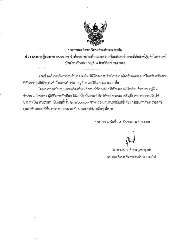 ประกาศผู้ชนะการเสนอราคา จ้างโครงการก่อสร้างถนนคอนกรีตเสริมเหล็กสายที่พักสงฆ์ปุณสีห์ไพรสณฑ์ บ้านโพนก้างปลา หมู่ที่ ๒ประกาศจัดซื้อจัดจ้างby กองคลัง อบต.ดงมะไฟประกาศผู้ชนะการเสนอราคา จ้างโครงการก่อสร้างถนนคอนกรีตเสริมเหล็กสายที่พักสงฆ์ปุณสีห์ไพรสณฑ์ บ้านโพนก้างปลา หมู่ที่ ๒ จำนวนผู้เข้าชม : 198 FacebookFacebookXXLINELine