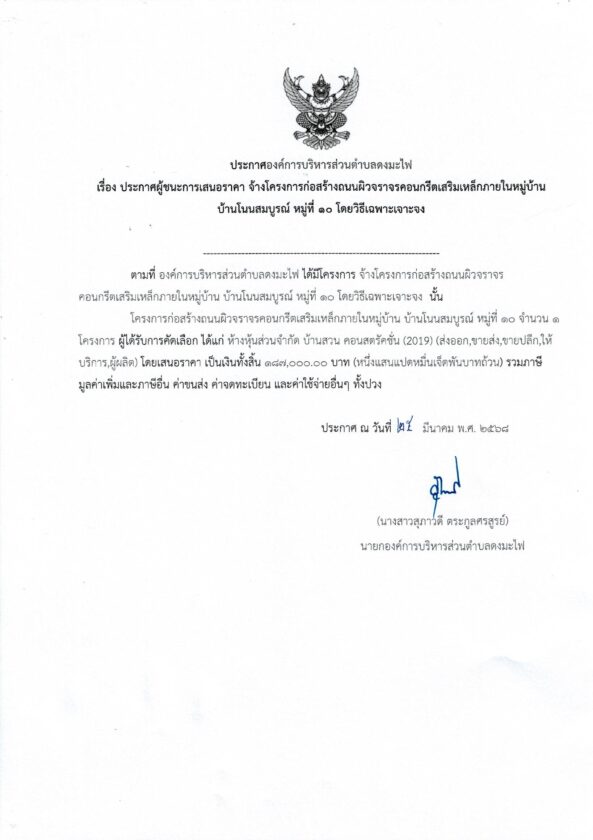 ประกาศผู้ชนะการเสนอราคา จ้างโครงการก่อสร้างถนนผิวจราจรคอนกรีตเสริมเหล็กภายในหมู่บ้าน บ้านโนนสมบูรณ์ หมู่ที่ ๑๐ประกาศจัดซื้อจัดจ้างby กองคลัง อบต.ดงมะไฟประกาศผู้ชนะการเสนอราคา จ้างโครงการก่อสร้างถนนผิวจราจรคอนกรีตเสริมเหล็กภายในหมู่บ้าน บ้านโนนสมบูรณ์ หมู่ที่ ๑๐ จำนวนผู้เข้าชม : 121 FacebookFacebookXXLINELine
