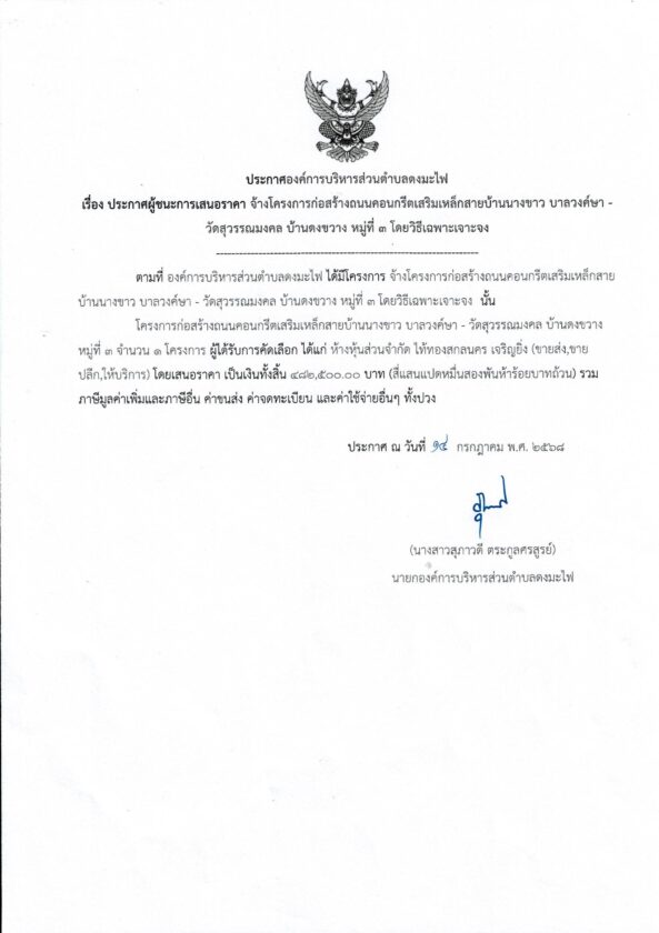 ประกาศผู้ชนะการเสนอราคา จ้างโครงการก่อสร้างถนนคอนกรีตเสริมเหล็กสายบ้านนางขาว บาลวงค์ษา – วัดสุวรรณมงคล บ้านดงขวาง หมู่ที่ ๓ประกาศจัดซื้อจัดจ้างby กองคลัง อบต.ดงมะไฟประกาศผู้ชนะการเสนอราคา จ้างโครงการก่อสร้างถนนคอนกรีตเสริมเหล็กสายบ้านนางขาว บาลวงค์ษา – วัดสุวรรณมงคล บ้านดงขวาง หมู่ที่ ๓ จำนวนผู้เข้าชม : 145 FacebookFacebookXXLINELine