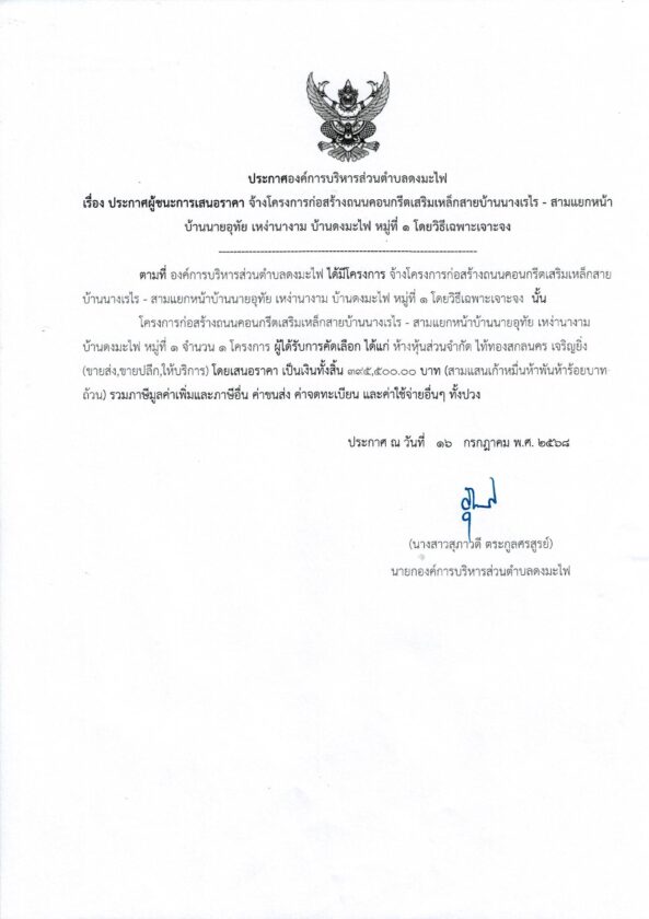 ประกาศผู้ชนะการเสนอราคา จ้างโครงการก่อสร้างถนนคอนกรีตเสริมเหล็กสายบ้านนางเรไร – สามแยกหน้าบ้านนายอุทัย เหง่านางาม บ้านดงมะไฟ หมู่ที่ ๑