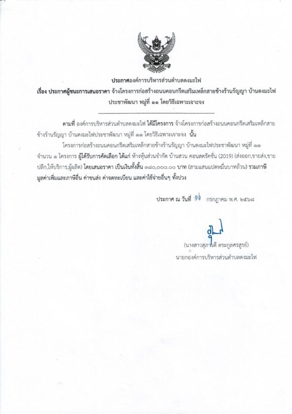 ประกาศผู้ชนะการเสนอราคา จ้างโครงการก่อสร้างถนนคอนกรีตเสริมเหล็กสายข้างร้านรัญญา บ้านดงมะไฟประชาพัฒนา หมู่ที่ ๑๑ประกาศจัดซื้อจัดจ้างby กองคลัง อบต.ดงมะไฟประกาศผู้ชนะการเสนอราคา จ้างโครงการก่อสร้างถนนคอนกรีตเสริมเหล็กสายข้างร้านรัญญา บ้านดงมะไฟประชาพัฒนา หมู่ที่ ๑๑ จำนวนผู้เข้าชม : 182 FacebookFacebookXXLINELine