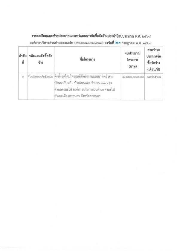 ประกาศเผยแพร่แผนการจัดซื้อจัดจ้าง โครงการติดตั้งชุดโคมไฟแอลอีดีพลังงานแสงอาทิตย์ สายบ้านนากับแก้ – บ้านโพนแดง จำนวน ๑๓๐ ชุด ตำบลดงมะไฟ องค์การบริหารส่วนตำบลดงมะไฟ อำเภอเมืองสกลนคร จังหวัดสกลนคร