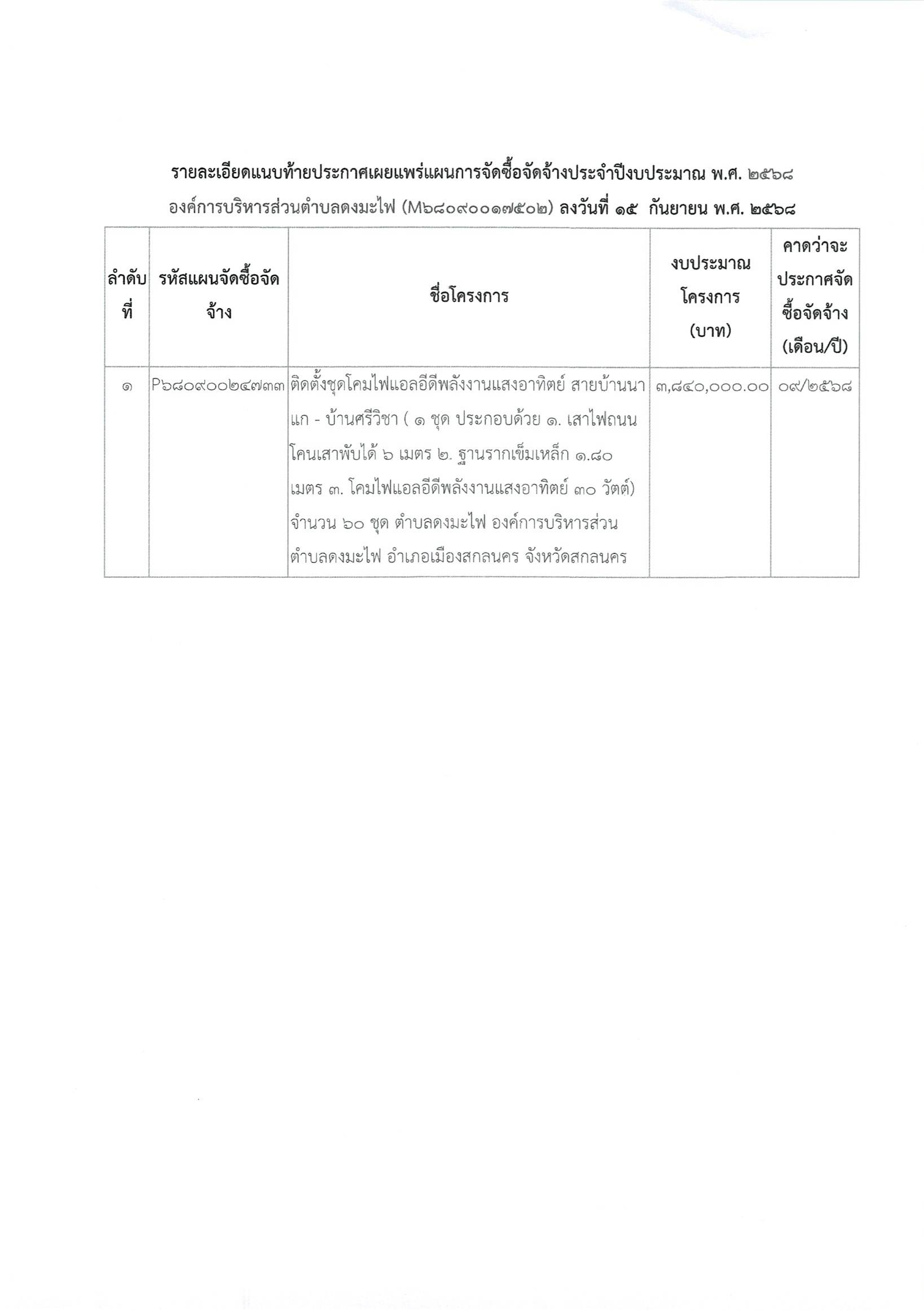 ประกาศเผยแพร่แผนการจัดซื้อจัดจ้าง โครงการติดตั้งชุดโคมไฟแอลอีดีพลังงานแสงอาทิตย์ สายบ้านนาแก – บ้านศรีวิชา (๑ ชุด ประกอบด้วย ๑. เสาไฟถนนโคนเสาพับได้ ๖ เมตร ๒. ฐานรากเข็มเหล็ก ๑.๘๐ เมตร ๓. โคมไฟแอลอีดีพลังงานแสงอาทิตย์ ๓๐ วัตต์) จำนวน ๖๐ ชุด ตำบลดงมะไฟ องค์การบริหารส่วนตำบลดงมะไฟ อำเภอเมืองสกลนคร จังหวัดสกลนคร