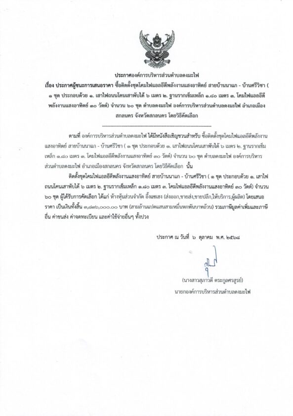 ประกาศผู้ชนะการเสนอราคา ซื้อติดตั้งชุดโคมไฟแอลอีดีพลังงานแสงอาทิตย์ สายบ้านนาแก – บ้านศรีวิชา ( ๑ ชุด ประกอบด้วย ๑. เสาไฟถนนโคนเสาพับได้ ๖ เมตร ๒. ฐานรากเข็มเหล็ก ๑.๘๐ เมตร ๓. โคมไฟแอลอีดีพลังงานแสงอาทิตย์ ๓๐ วัตต์) จำนวน ๖๐ ชุด ตำบลดงมะไฟ องค์การบริหารส่วนตำบลดงมะไฟ อำเภอเมืองสกลนคร จังหวัดสกลนคร