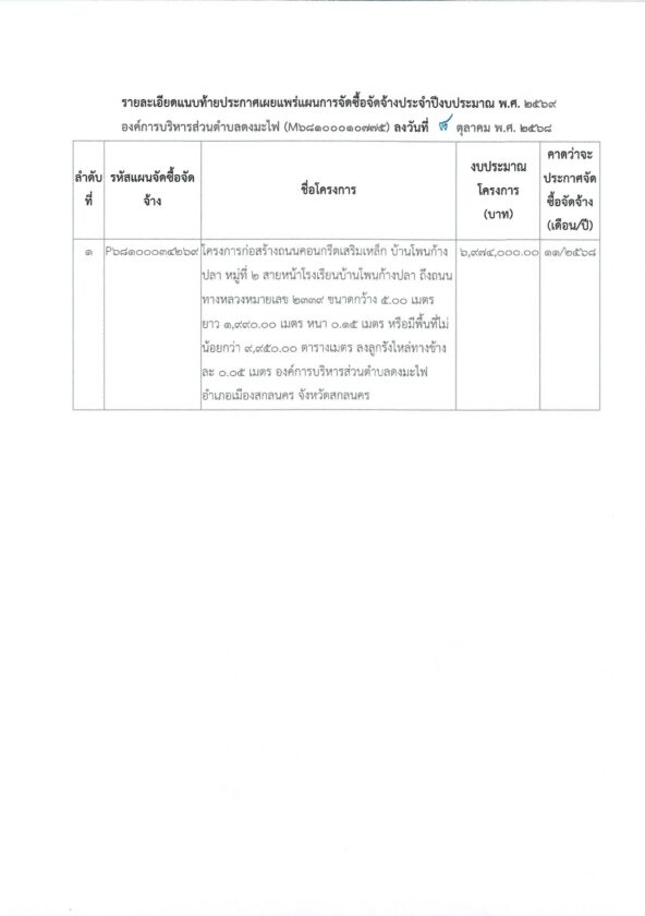 ประกาศเผยแพร่แผนการจัดซื้อจัดจ้าง โครงการก่อสร้างถนนคอนกรีตเสริมเหล็ก บ้านโพนก้างปลา หมู่ที่ ๒ สายหน้าโรงเรียนบ้านโพนก้างปลา ถึงถนนทางหลวงหมายเลข ๒๓๓๙ ขนาดกว้าง ๕.๐๐ เมตร ยาว ๑,๙๙๐.๐๐ เมตร หนา ๐.๑๕ เมตร หรือมีพื้นที่ไม่น้อยกว่า ๙,๙๕๐.๐๐ ตารางเมตร ลงลูกรังไหล่ทางข้างละ ๐.๐๕ เมตร องค์การบริหารส่วนตำบลดงมะไฟ อำเภอเมืองสกลนคร จังหวัดสกลนคร