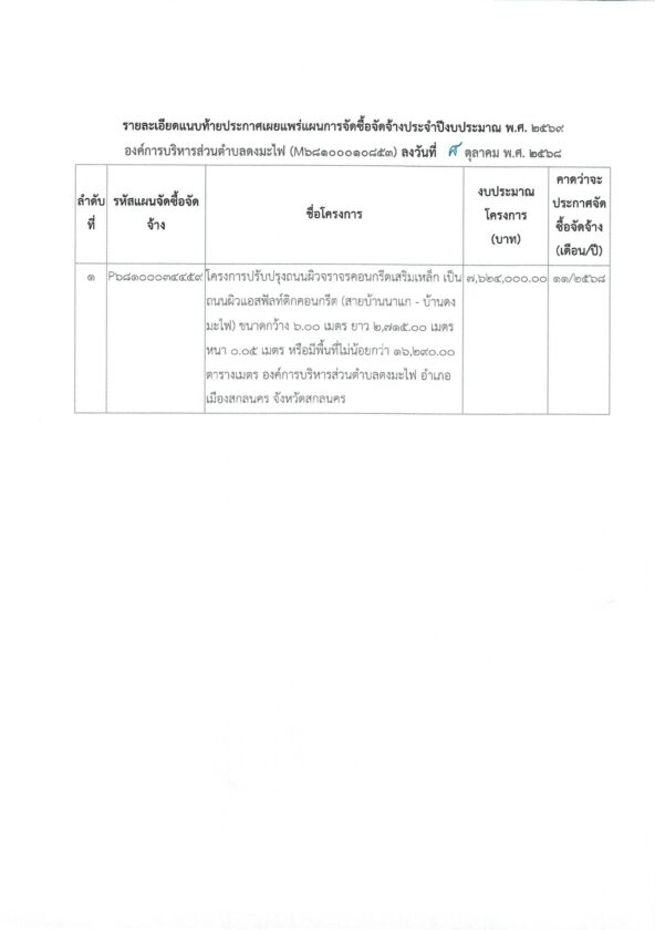 ประกาศเผยแพร่แผนการจัดซื้อจัดจ้าง โครงการปรับปรุงถนนผิวจราจรคอนกรีตเสริมเหล็ก เป็นถนนผิวแอสฟัลท์ติกคอนกรีต (สายบ้านนาแก – บ้านดงมะไฟ) ขนาดกว้าง ๖.๐๐ เมตร ยาว ๒,๗๑๕.๐๐ เมตร หนา ๐.๐๕ เมตร หรือมีพื้นที่ไม่น้อยกว่า ๑๖,๒๙๐.๐๐ ตารางเมตร องค์การบริหารส่วนตำบลดงมะไฟ อำเภอเมืองสกลนคร จังหวัดสกลนคร