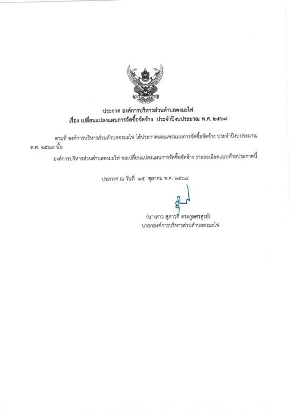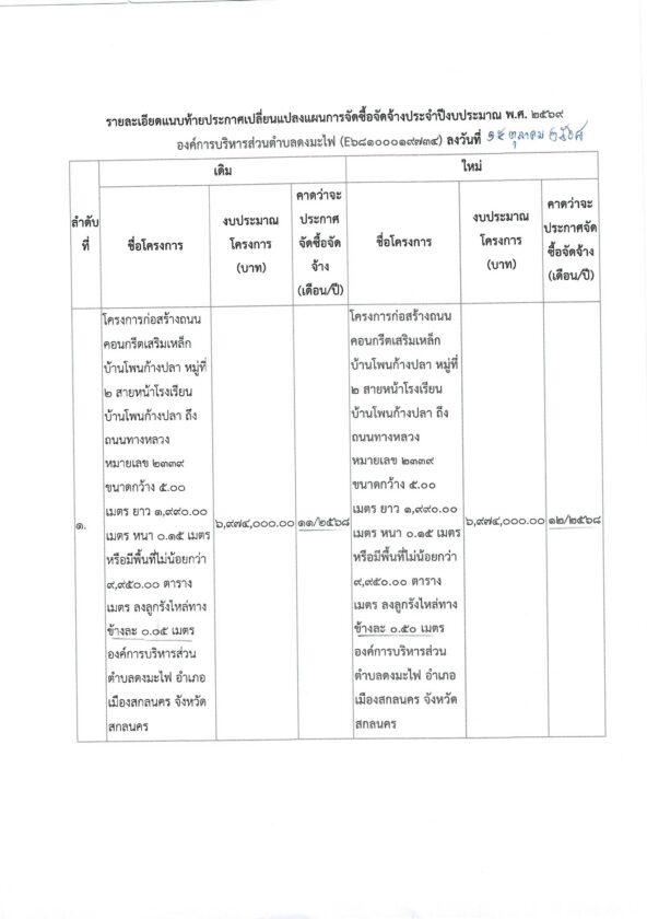 ประกาศ เปลี่ยนแปลงแผนการจัดซื้อจัดจ้าง โครงการก่อสร้างถนนคอนกรีตเสริมเหล็ก บ้านโพนก้างปลา หมู่ที่ ๒ สายหน้าโรงเรียนบ้านโพนก้างปลา ถึงถนนทางหลวงหมายเลข ๒๓๓๙ ขนาดกว้าง ๕.๐๐ เมตร ยาว ๑,๙๙๐.๐๐ เมตร หนา ๐.๑๕ เมตร หรือมีพื้นที่ไม่น้อยกว่า ๙,๙๕๐.๐๐ ตารางเมตร ลงลูกรังไหล่ทางข้างละ ๐.๕๐ เมตร องค์การบริหารส่วนตำบลดงมะไฟ อำเภอเมืองสกลนคร จังหวัดสกลนคร