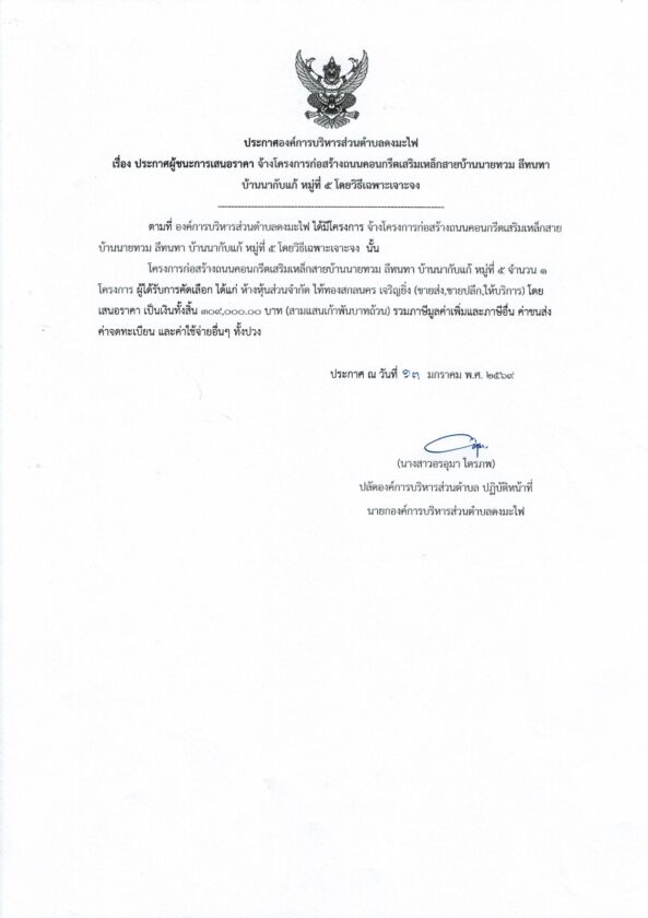 ประกาศผู้ชนะการเสนอราคา จ้างโครงการก่อสร้างถนนคอนกรีตเสริมเหล็กสายบ้านนายทวม ลีทนทา บ้านนากับแก้ หมู่ที่ ๕ประกาศจัดซื้อจัดจ้างby กองคลัง อบต.ดงมะไฟประกาศผู้ชนะการเสนอราคา จ้างโครงการก่อสร้างถนนคอนกรีตเสริมเหล็กสายบ้านนายทวม ลีทนทา บ้านนากับแก้ หมู่ที่ ๕ จำนวนผู้เข้าชม : 44 FacebookFacebookXXLINELine