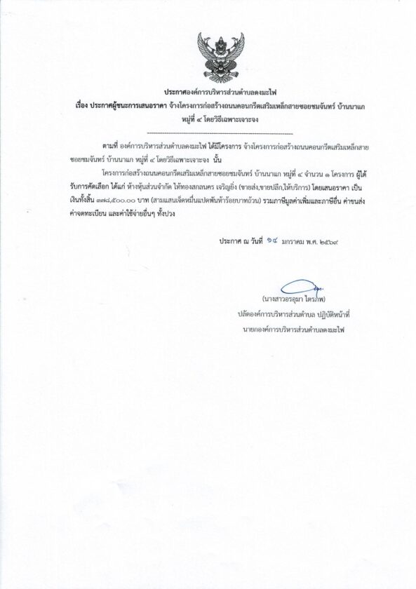 ประกาศผู้ชนะการเสนอราคา จ้างโครงการก่อสร้างถนนคอนกรีตเสริมเหล็กสายซอยชมจันทร์ บ้านนาแก หมู่ที่ ๔ประกาศจัดซื้อจัดจ้างby กองคลัง อบต.ดงมะไฟประกาศผู้ชนะการเสนอราคา จ้างโครงการก่อสร้างถนนคอนกรีตเสริมเหล็กสายซอยชมจันทร์ บ้านนาแก หมู่ที่ ๔ จำนวนผู้เข้าชม : 54 FacebookFacebookXXLINELine
