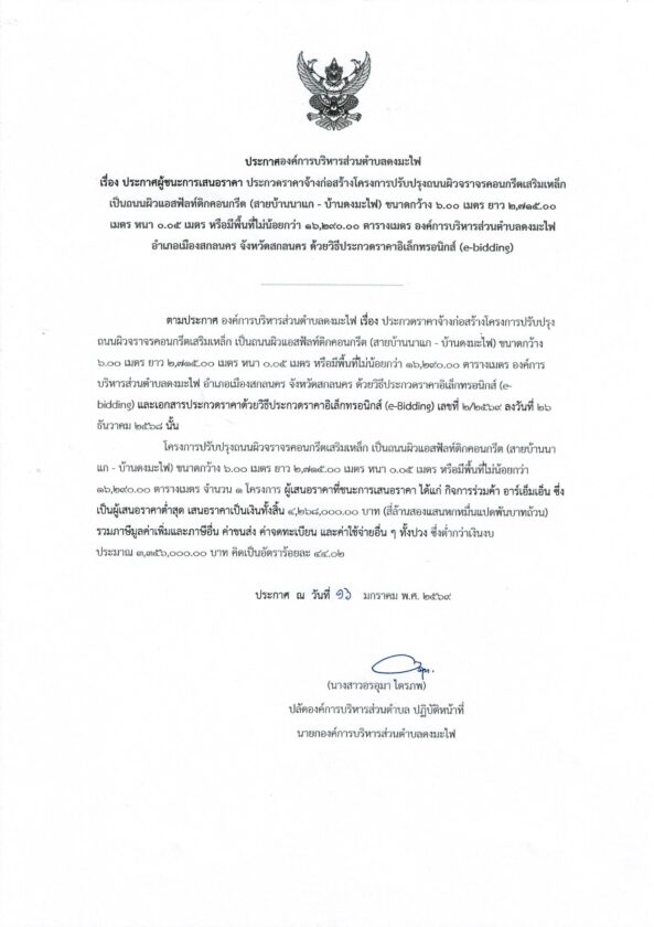 ประกาศผู้ชนะการเสนอราคา ประกวดราคาจ้างก่อสร้างโครงการปรับปรุงถนนผิวจราจรคอนกรีตเสริมเหล็ก เป็นถนนผิวแอสฟัลท์ติกคอนกรีต (สายบ้านนาแก – บ้านดงมะไฟ) ขนาดกว้าง ๖.๐๐ เมตร ยาว ๒,๗๑๕.๐๐ เมตร หนา ๐.๐๕ เมตร หรือมีพื้นที่ไม่น้อยกว่า ๑๖,๒๙๐.๐๐ ตารางเมตร องค์การบริหารส่วนตำบลดงมะไฟ อำเภอเมืองสกลนคร จังหวัดสกลนคร